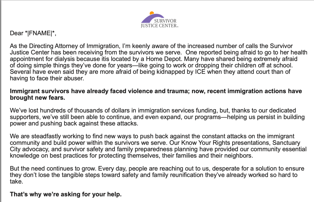 In an effort to uplift the voices of Survivor Justice Center staff, we tested two fundraising letters; one was from the perspective of our Executive Director, while the other was from our lead immigration attorney. I played a key role in drafting and editing these letters.